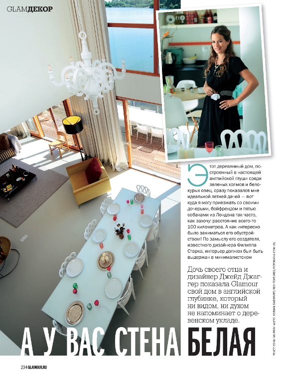 Джейд Джаггер открывает двери своего дома в английской глубинке, куда она так любит приезжать с дочерьми, бойфрендом и пятью собаками. Летняя дача с белыми стенами, панорамными окнами и яркими красочными акцентами ни видом, ни духом не напоминает о деревенском укладе. Дизайнер ювелирных украшений и известная светская тусовщица рассказывает читателям Glamour, как она занималась обустройством дома, и делится секретами оформления интерьера.