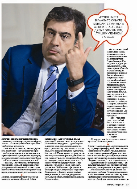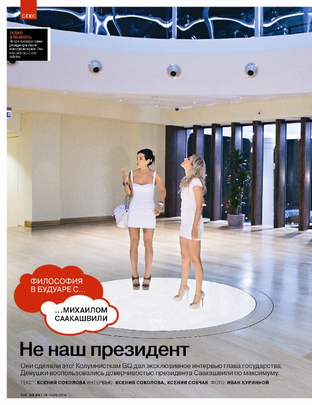 Колумнистки GQ Ксения Соколова и Ксения Собчак взяли первое эксклюзивное интервью у Президента Грузии Михаила Саакашвили после военного конфликта с Россией. В большом материале вышедшем в октябрьском номере GQ затронут широкий спектр тем от государственной политики Грузии, до сексуальных разногласий главы грузинского народа с телеведущей Тиной Канделаки. За время своего визита в Тбилиси Ксении Соколовой и Ксении Собчак удалось провести ночь в президентском дворце, совершить перелет в Батуми на стремительном Challenger, прикоснуться к золотым львам и появиться в здании Конституционного суда в майке с изображением премьер–министра России Владимира Владимировича Путина, чем не на шутку напугали президентскую пресс-службу. Михаил Саакашвили оказался гостеприимным хозяином, энергичным экскурсоводом и откровенным собеседником. Первую часть интервью читайте на страницах октябрьского GQ.