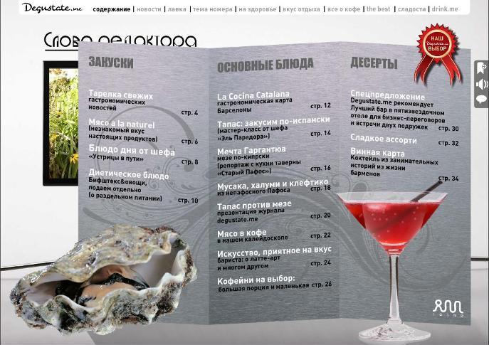 Щелчком мыши мы разворачиваем содержание, стилизованное под ресторанное меню и отправляемся в путешествие по новому номеру первого гастрономического издания подобного формата.