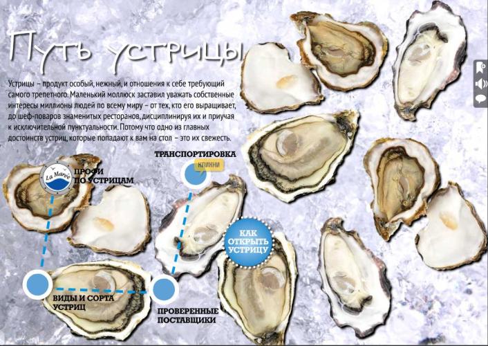 Ну вот, кому-то с наступлением осени хочется согреться любимым кофейным напитком , а любители морских деликатесов вспоминают, что наступает сезон устриц. Открывается разворот и шаг за шагом мы можем пройти путь устрицы, кликая по маршруту. Не так-то просто ей добраться до нашего стола, сохранив свежесть. А для тех, кому не так-то просто устрицу открыть, специальный видео мастер-класс.