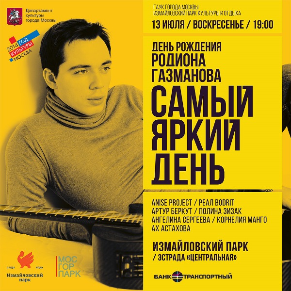 Концерт Родиона Газманова станет частью воскресной программы Измайловского парка "Самый яркий день". В этот день все посетители получат краски и смогут нарисовать свою часть общей картины.