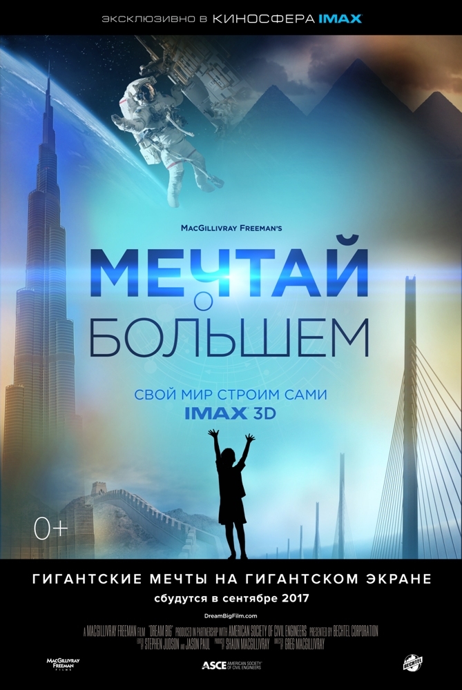 «Мечтай о большем» - первый фильм, рассказывающий о невероятной работе инженеров во всем мире. Фильм озвучен лауреатом премии «Оскар» Джефом Бриджесом и создан специально для гигантских экранов IMAX. Формат IMAX идеально подходит для истории о великих сооружениях, поскольку изображения огромных конструкций выглядят впечатляюще на гигантском экране. Зрители увидят, какие уникальные технологии используют в работе инженеры, чтобы сделать этот мир лучше, безопаснее и прекраснее. Ведь самые великие изобретения человечества когда-то были чьей-то большой мечтой. А мир завтрашнего дня создают сегодняшние мечтатели.