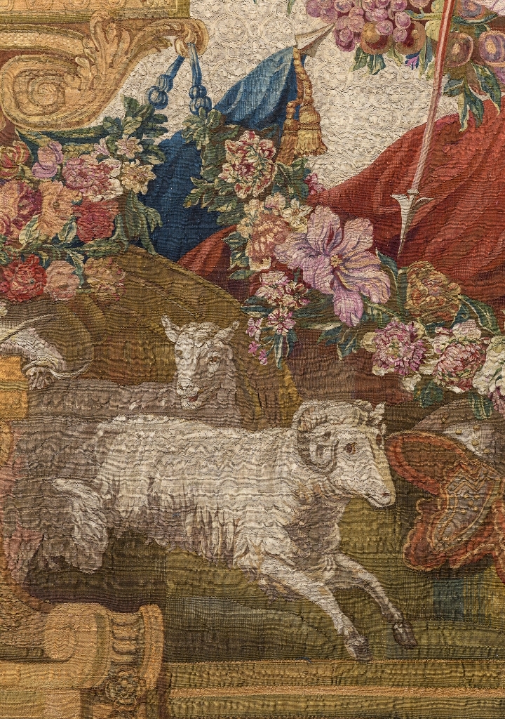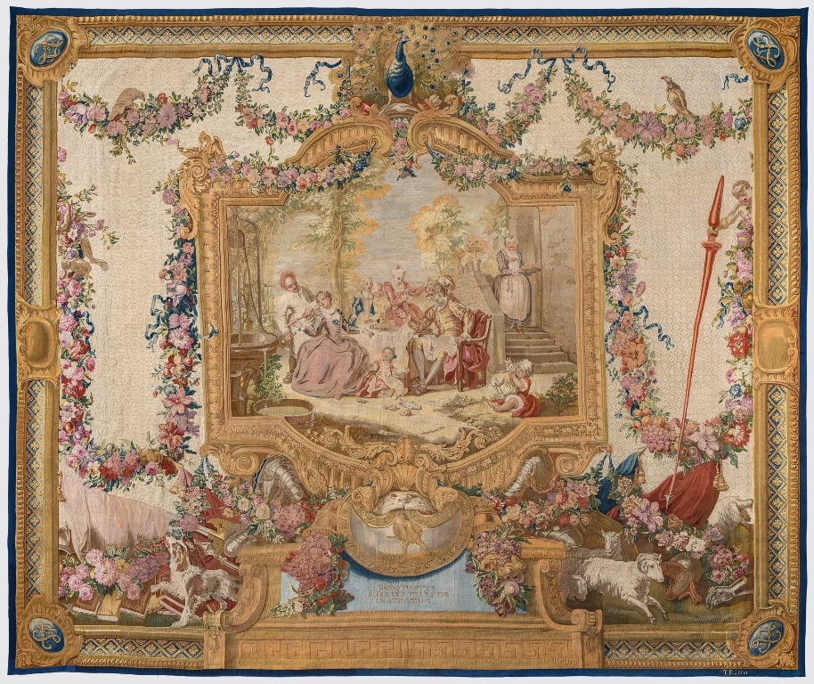 Гобелен из Музеев Московского Кремля принадлежит к шестому повторению (1751-1763, из двадцати трех ковров и шести портьер) с пятым декоративным обрамлением, написанным художником-орнаменталистом Валадом под руководством Ш.-А. Куапеля. Гобелен поступил в собрание Музеев Московского Кремля из дворцового имущества вместе с еще тремя коврами этой группы.
