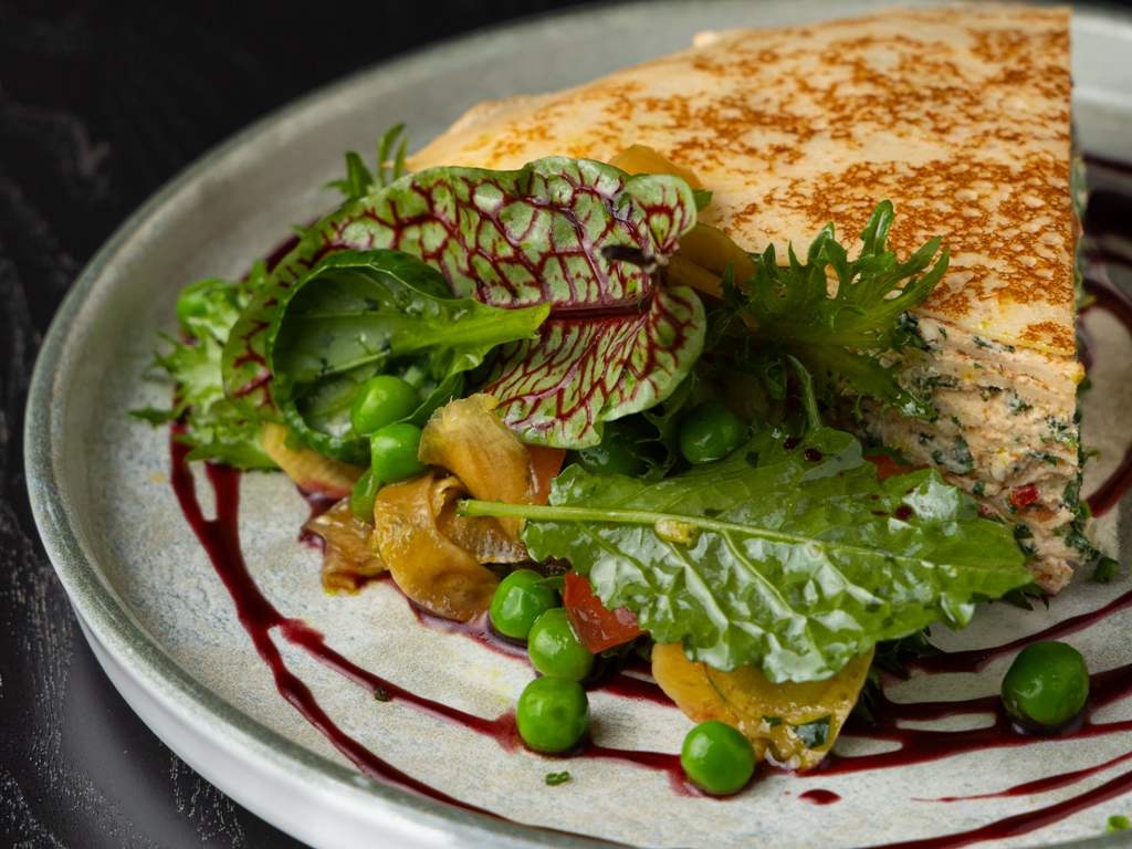 Блинный торт шеф-повар Павел Тарасов делает на основе зож-блинов из кабачков и шпината, а в качестве «крема» выступает риет из красных рыб. Декорируют блинный торт отборной красной икрой и при подаче дополняют сливочным шампань-соусом.
