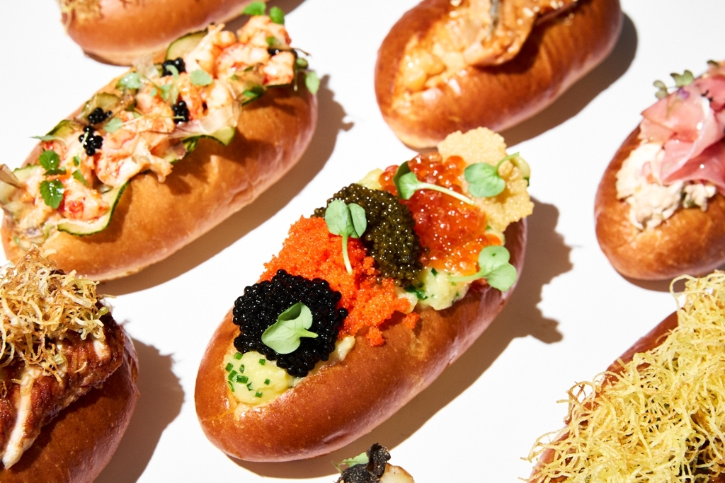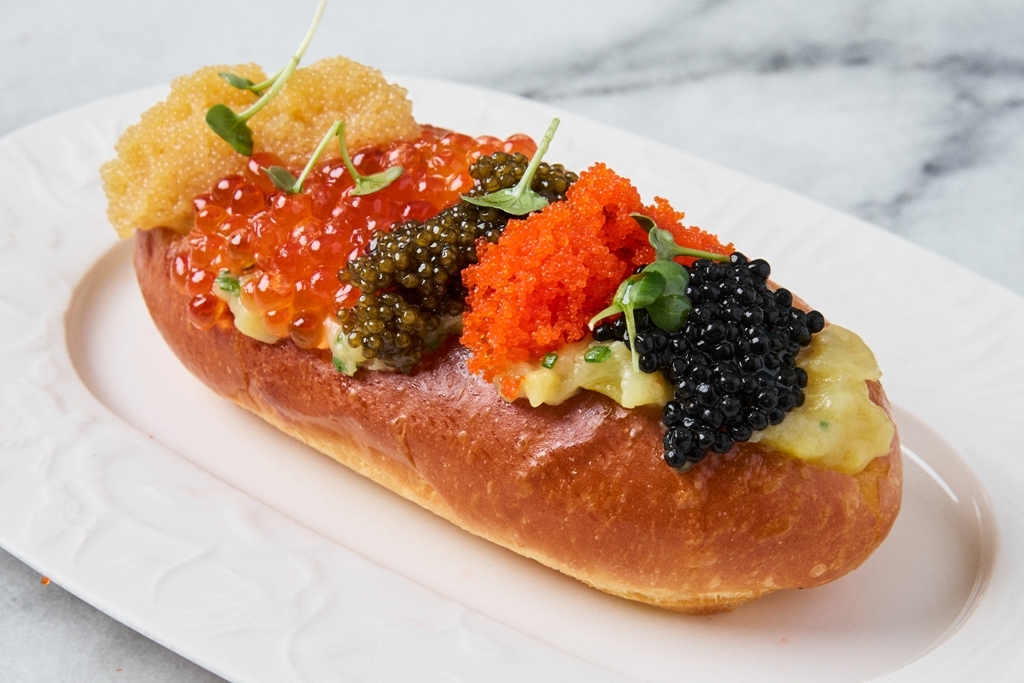 И наконец, главный кандидат на роль звезды фестиваля — моредог с пятью видами икры. Здесь объединили чёрную осетровую икру, красную икру горбуши, щучью икру, икру палтуса и японскую тобико. А чтобы подчеркнуть их особенные деликатные вкусы, икру дополняют мятым молодым картофелем, запеченным на соли.