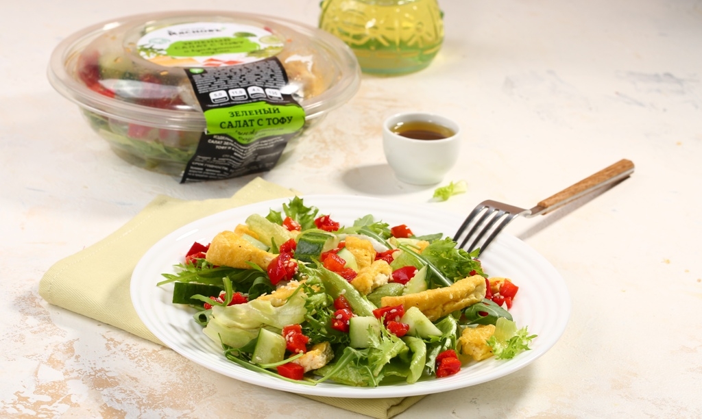 В зелёном салате с тофу и кунжутным соусом тофу не «скучная» замена мяса, а полноценный растительный белок в азиатском обрамлении. Ароматный соус на кунжутном масле с гармоничным букетом специй добавляет этому блюду глубины и придает ему лёгкий ореховый аромат.
